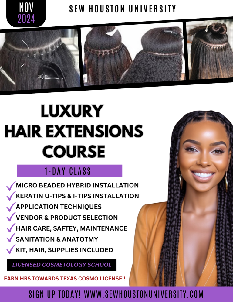 At Sew Houston University we are committed to your success. Upon completing our Texas cosmetology program and passing the state board exam, you will receive your Texas cosmetology license as a Hair Weaving Specialist, opening doors to a myriad of career opportunities in the beauty industry.
